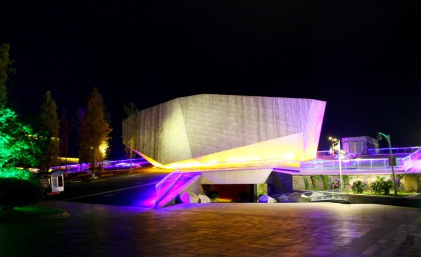 幸福館以羌族所崇拜的白石為主題。護欄中嵌入的線條燈采用密集小功率燈珠和小角度透鏡,透過玻璃圍欄照射到下方不銹鋼底座上,線條燈反射出藍寶石的效果,達到見光不見燈的效果。同時在原有藍寶石造型的玻璃天臺中加入特定波長的藍色光源,讓出光效果更為接近寶石藍,成為幸福館的一大亮點。