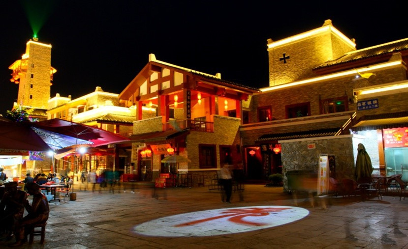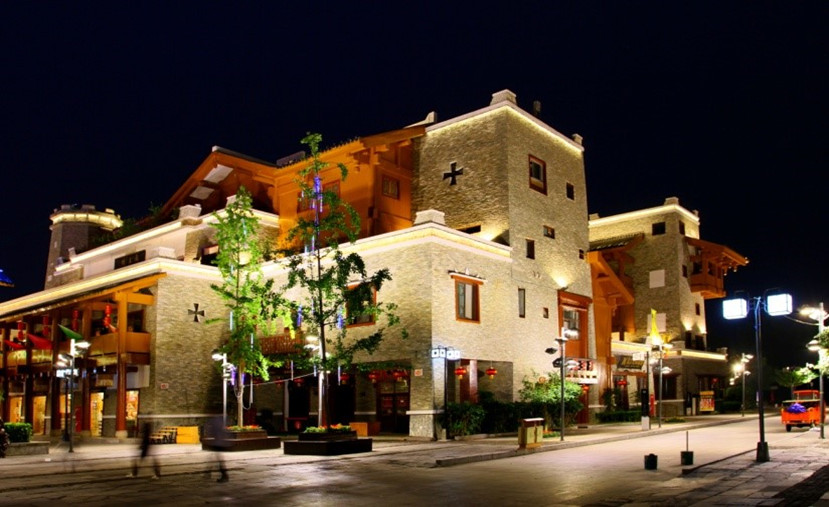街區(qū)建筑物在房檐上設(shè)置RGB廣角小射燈,墻體中部配裝壁燈,頂部為LED洗墻燈,完整的勾勒出建筑物整體輪廓。建筑物瓦面的處理,僅采用硬條燈打亮屋脊的造型,壓低屋面整體亮度,明暗對比形成內(nèi)斂的神秘感。小投影燈在地面上投出羌族文化特色的圖案,小巧而精致,別有一番趣味