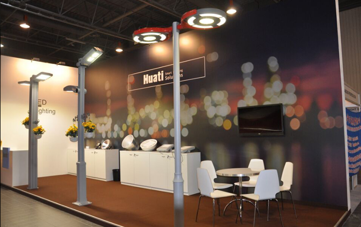 華體照明公司展位位于3號館,總面積為27平米。展位以大幅的燈光虛化意象圖片為背景,展臺上安裝的3組燈桿以淺灰為主色,燈頭搭配自主設(shè)計研發(fā)的皓月、弦木、萬象、曙光燈頭,整燈呈現(xiàn)簡約、時尚之感。另外,為體現(xiàn)此次展會“智慧照明”的主題,每組燈里面都安裝單燈控制器。展示臺上擺放工礦燈、泛光燈、投光燈以及新研發(fā)的庭院燈模組,便于客戶更加直觀地了解產(chǎn)品的品質(zhì)和結(jié)構(gòu)。