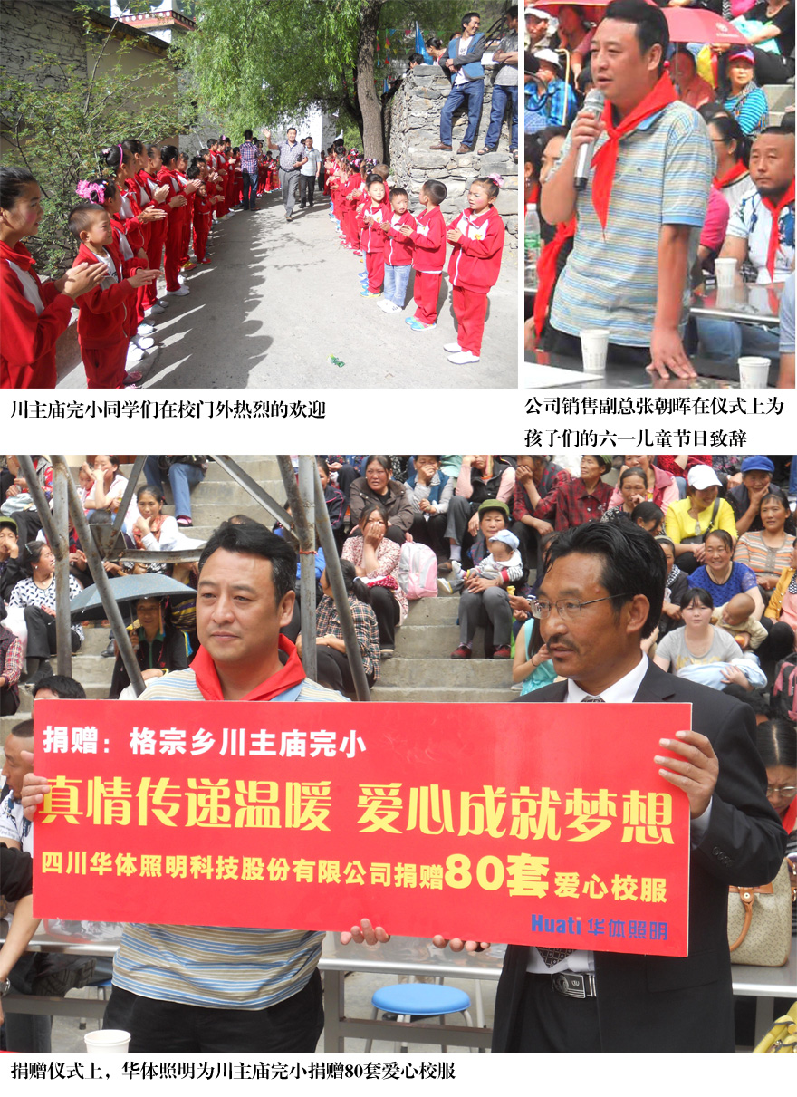 5月30日,四川華體照明科技股份有限公司銷(xiāo)售副總張朝暉一行來(lái)到四川省丹巴縣格宗鄉(xiāng)絨壩溝的川主廟完小,與該校同學(xué)們共同慶?!傲粐?guó)際兒童節(jié)”,并為該校學(xué)生送去了華體的愛(ài)心——捐贈(zèng)80套愛(ài)心校服,情暖校園。