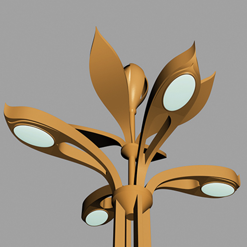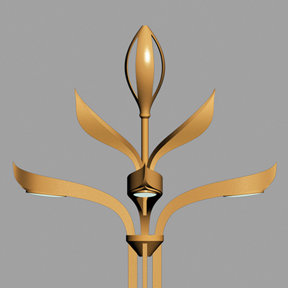 燈具的設(shè)計(jì)主要通過花卉造型進(jìn)行抽象設(shè)計(jì)而來,結(jié)合現(xiàn)代工藝轉(zhuǎn)化為集景觀與功能照明為一體的戶外照明工具;